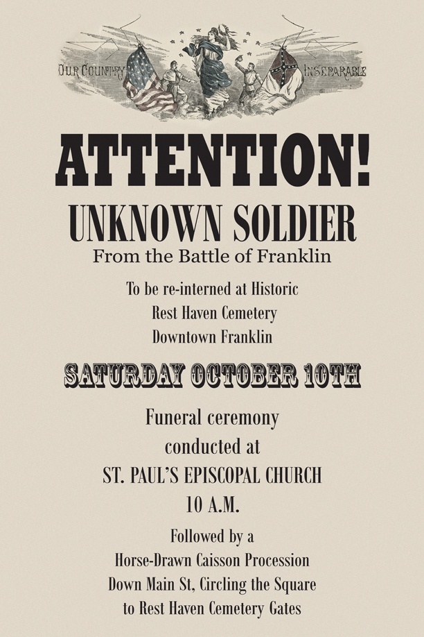 Downtown Franklin Saturday, October 10 Funeral Ceremony conducted at St.Paul's Episcopal Church 10 a.m. Followed by a Horse-drawn Caisson Procession down Main St., Circling the Square to Rest Haven Cemetery Gates Hosted by SUVCW Fort Donelson Camp # 62 SCV Sam Davis Camp # 1293